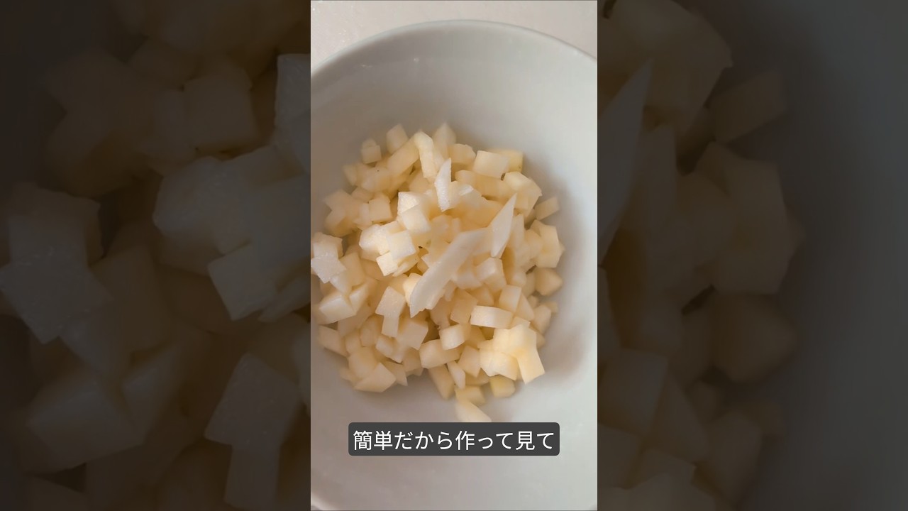 りんご 1個 5ミリのサイコロ状に切り、レンジで 2分から3分 柔らかくなるまで様子を見ながら、時々混ぜて火を通す。