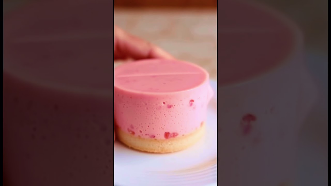 Watch as a knife smoothly cuts through a pink mousse cake with a yellow sponge base in this satisfying video! This cake cutting demonstration shows the process step by step, for this easy recipe. This dessert is sure to please any cake lover! #satisfying #asmrvideos #baking